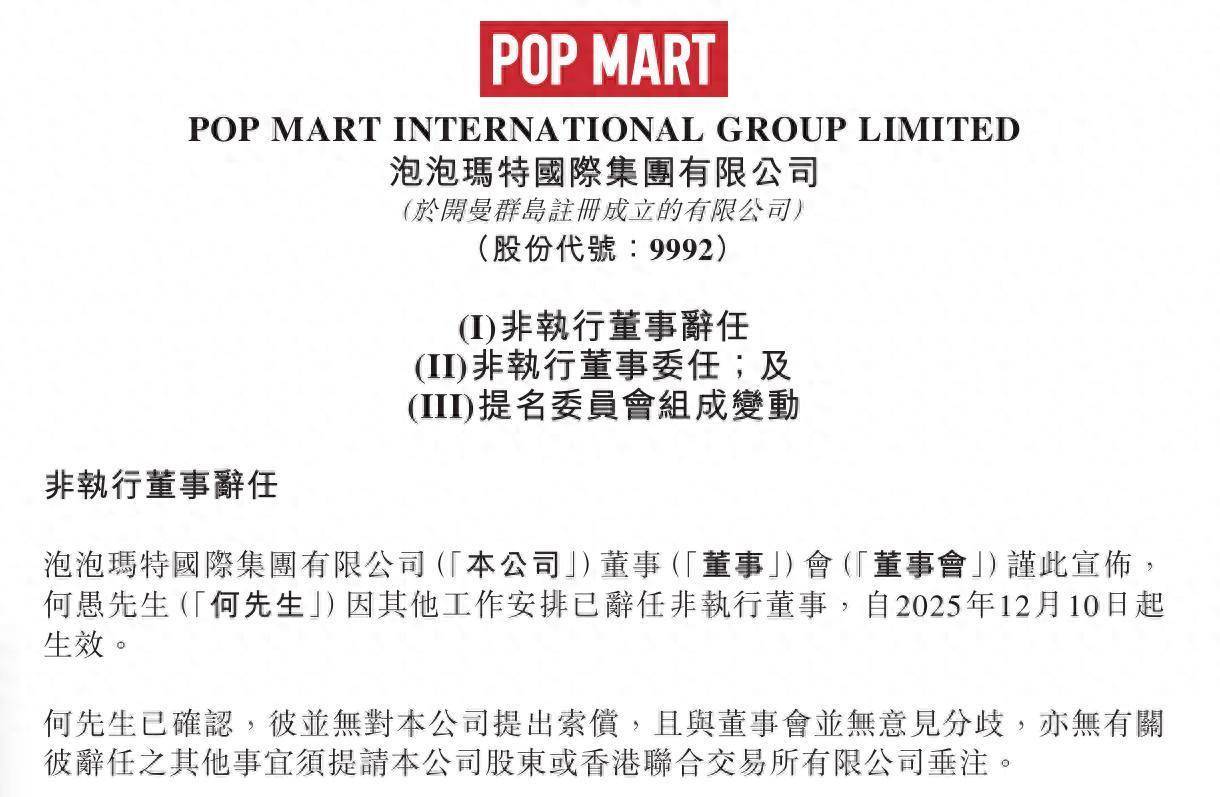 12月10盘后,泡泡玛特(09992)公告称,公司董事会谨此宣布,何愚先生因其他工作安排已辞任非执行董事,自2025年12月10日起生效。